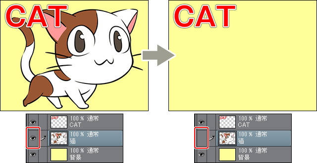 このイラストは「CAT」の文字、「猫」、「背景」の3枚のレイヤーが使われています。