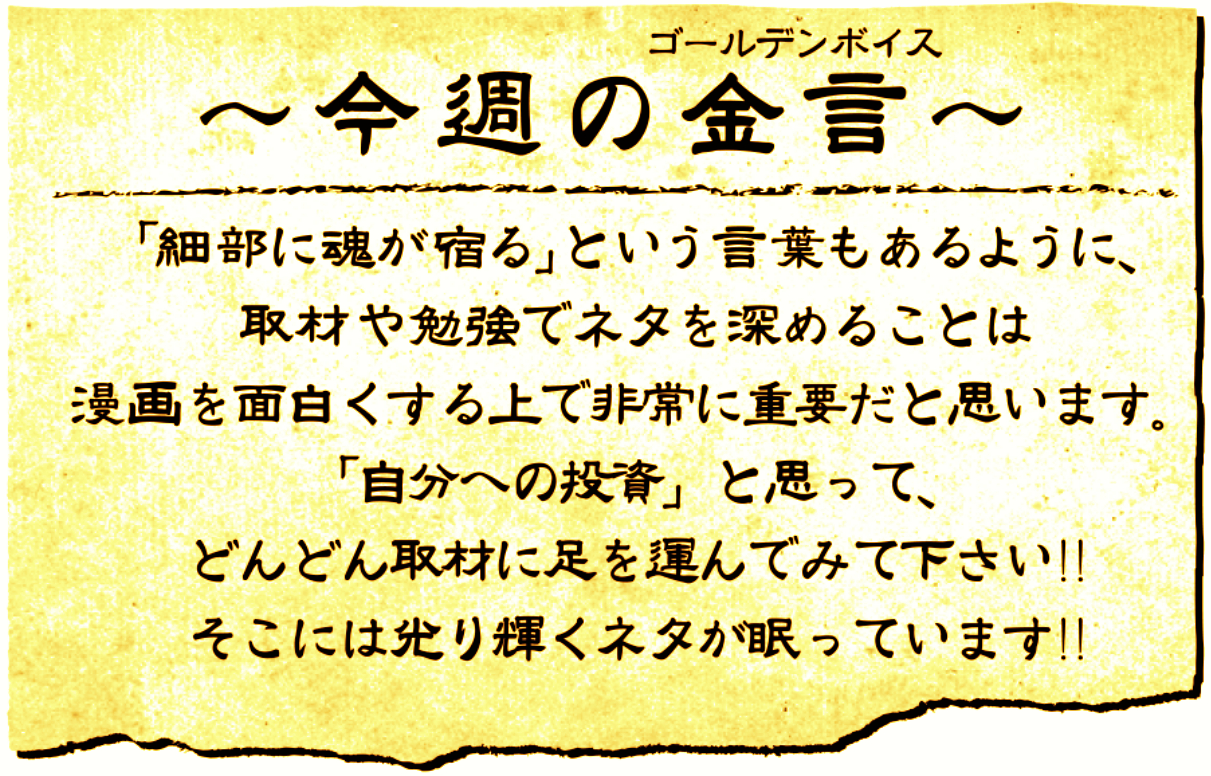 その中でも、僕は取材で出会った方々とのお話が漫画に大きく活かされると思います。一度の取材が十冊の本を読むことよりも実になる場合があります。