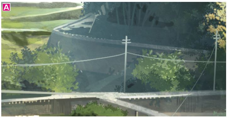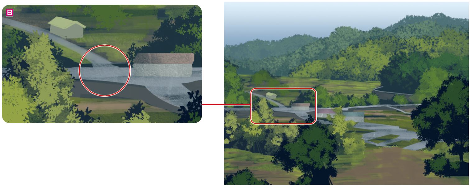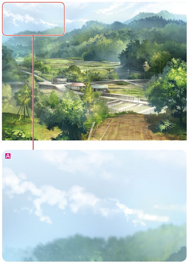 A 遠景を塗ったレイヤーの上に合成モード「スクリーン」や「乗算」のレイヤーを作成し、空の色に近い色でかすませていく。遠景の情報量を抑えて遠近感を強めるとともに、全体の色がまとまり、画面に統一感が出る。同時に、空気のムラを表現できるため、リアルさも出る。