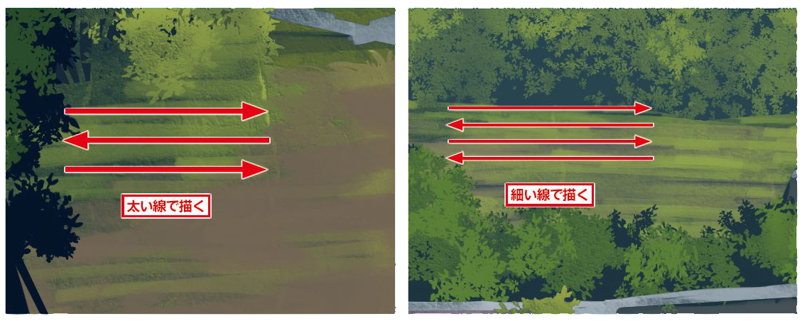 地面や道といった横に広がっているものは縦方向のブラシの動きで描いてしまうと、イラストが立ち上がって見えるため、違和感が出てしまいます。