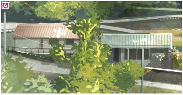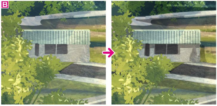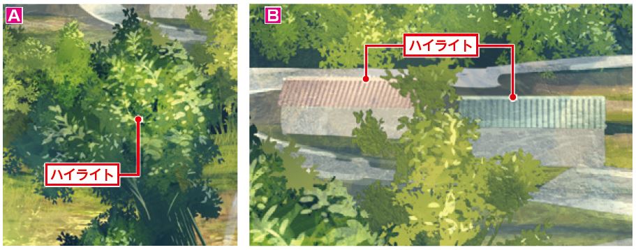 B 家や道路のフチなどのエッジの利いている部分にハイライトを入れることで、物の輪郭を強調できる。