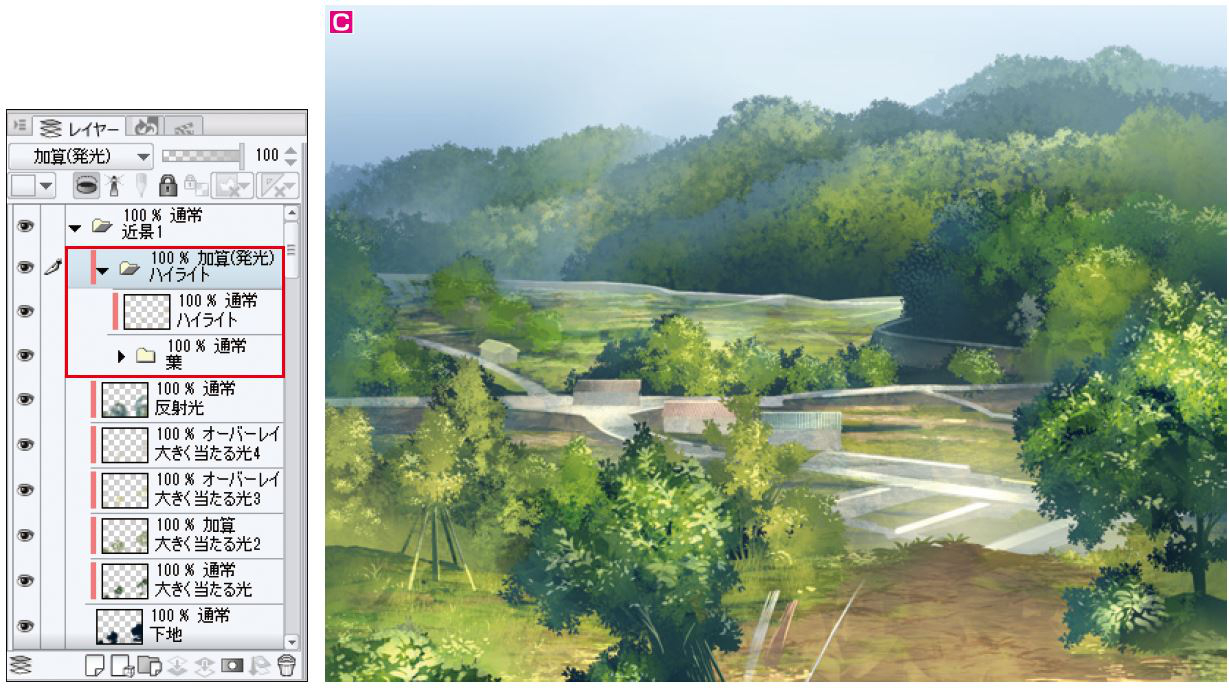 A 各レイヤーフォルダーの一番上に「加算(発光)」のレイヤーフォルダーを作成し、その中に細かい部位ごとのレイヤーを作成しながらハイライトを入れていく。近景や視線を集めたい部分を重点的にハイライトを入れていくが、ただ明るくするだけでなく、葉などの細かい形も表現していく。