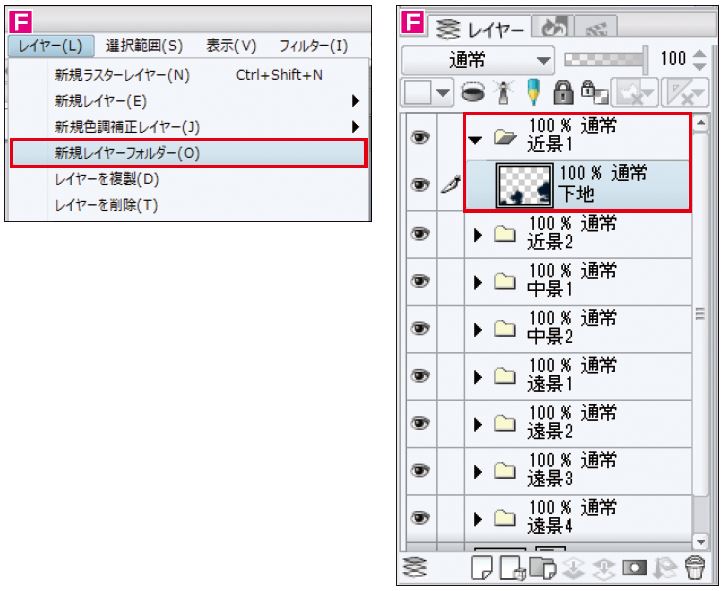 F レイヤーが増えてきたら、[レイヤー]メニュー→[新規レイヤーフォルダー]を選択してレイヤーフォルダーを作成し、まとめておく。