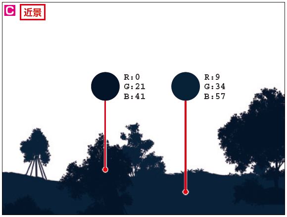 さらに、色相も少しずつずらしていきます。このイラストの場合は、近景が濃い紺色で、中景に向かって青色になり、遠景にいくほど薄い緑色へと変化しています。