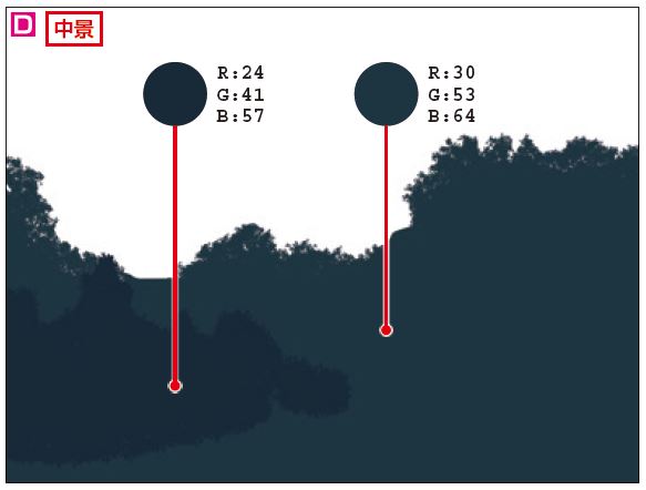 D 中景も同じように塗っていく。近景よりも薄い色を使用する。なお、近景で隠れてしまうような部分は、形を作る必要はない。