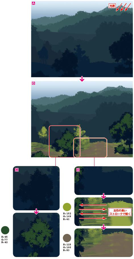 B 地続きの前後のつながりもここで描く。あまり極端な色の変化にならないように心がける。