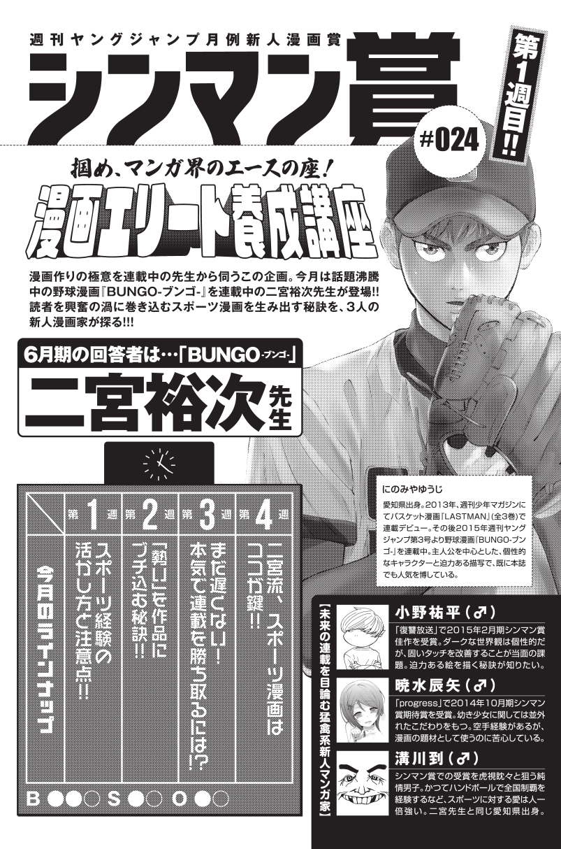 漫画作りの極意を連載中の先生から伺うこの企画。今回は週刊ヤングジャンプにて野球漫画『BUNGO-ブンゴ-』を連載中の二宮裕次先生が登場!!読者を興奮の渦に巻き込むスポーツ漫画を生み出す秘訣を、3人の新人漫画家が探る!!! ヤングジャンプ新人漫画賞「シンマン賞」大人気企画からインタビューを特別掲載!