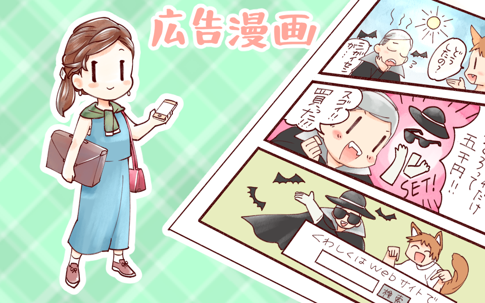 企業公式サイトに載っている商品の説明漫画、ダイレクトメールに載っている宣伝漫画、チラシに描かれている漫画など、広告目的で用いられる漫画です。