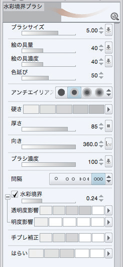 ↑[水彩境界ブラシ]の設定。[繊維塗りブラシ]と同様に[水彩]の[不透明水彩]を元に作成しています。