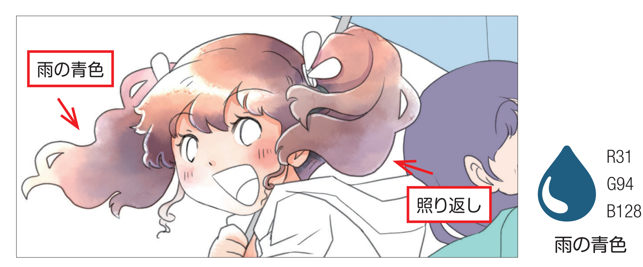 さらに雨をイメージした青色を向かって左側にも入れてあります。こうすることでリアルさもアップしますし、結果的に顔の中心が濃くなることで、そこを目立たせることも可能です。