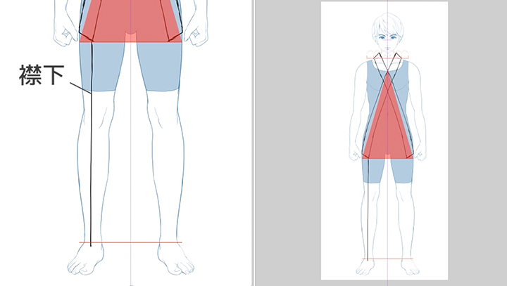 次は下半身です。イラストでは足を肩幅まで広げていますが、あまり裾が広がり過ぎない方が見栄えがよいかと思います。