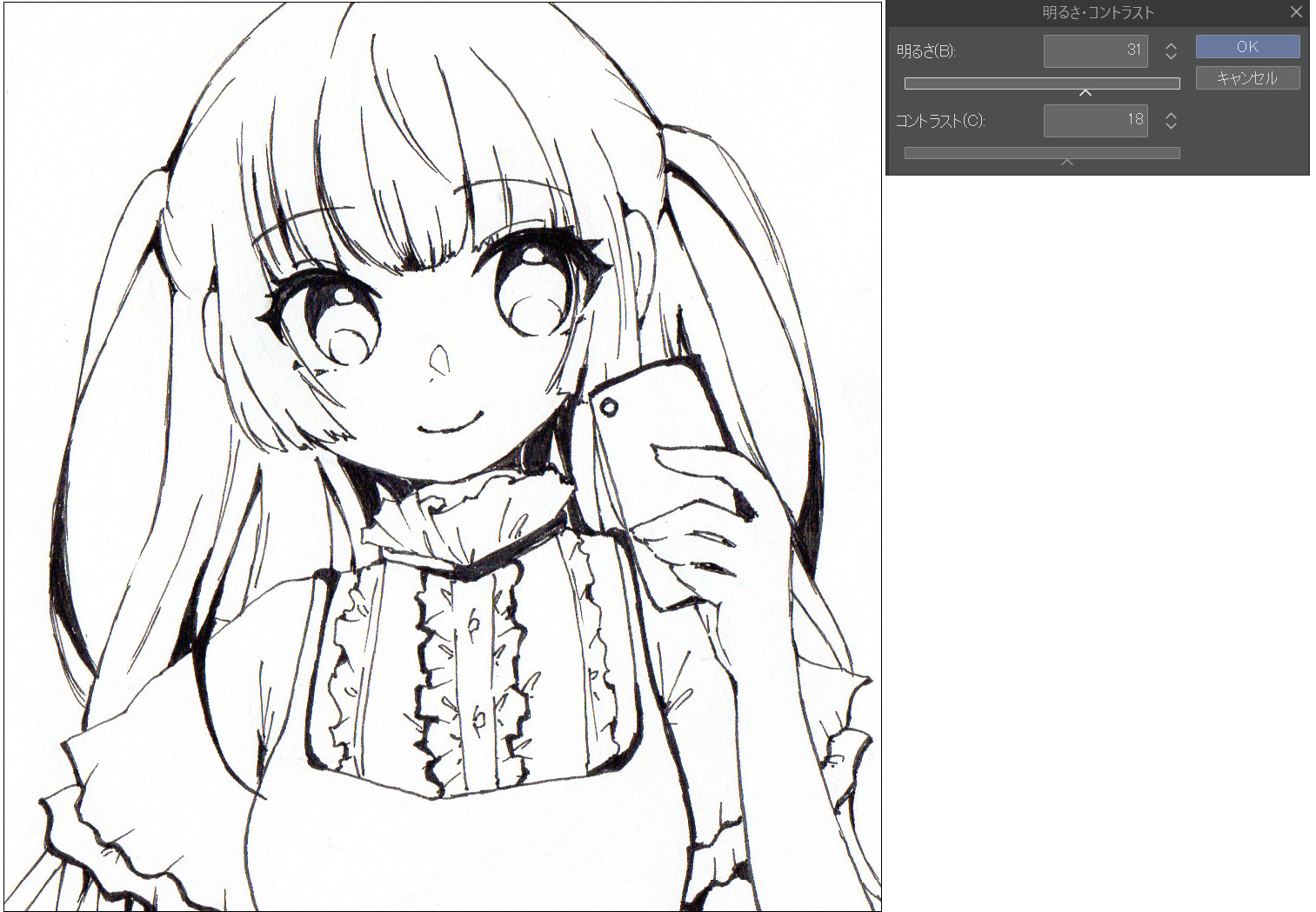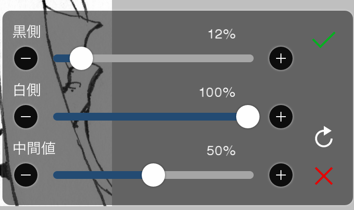 その後、線画の色が薄いと感じたら[黒側]のスライダーを動かしましょう。