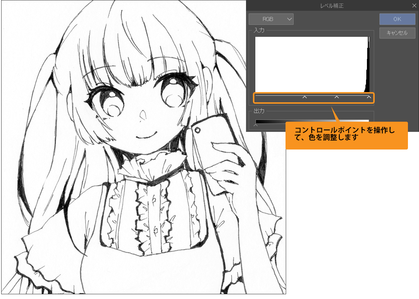 次に、[レベル補正]で線画をはっきりとさせます。[レベル補正]では、画像のシャドウ(陰)となる部分、中間調、ハイライトの照度を調整できます。