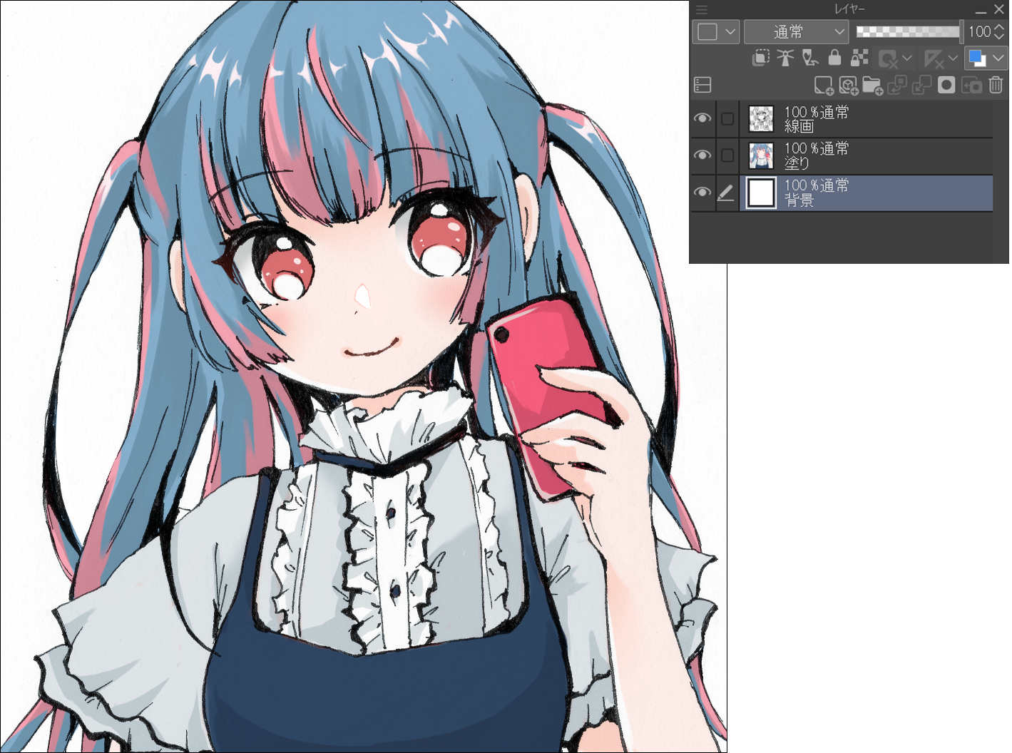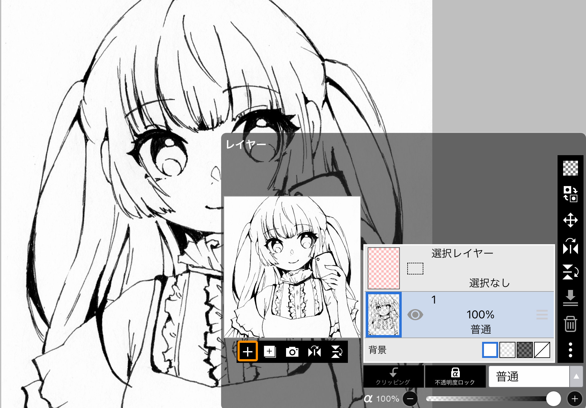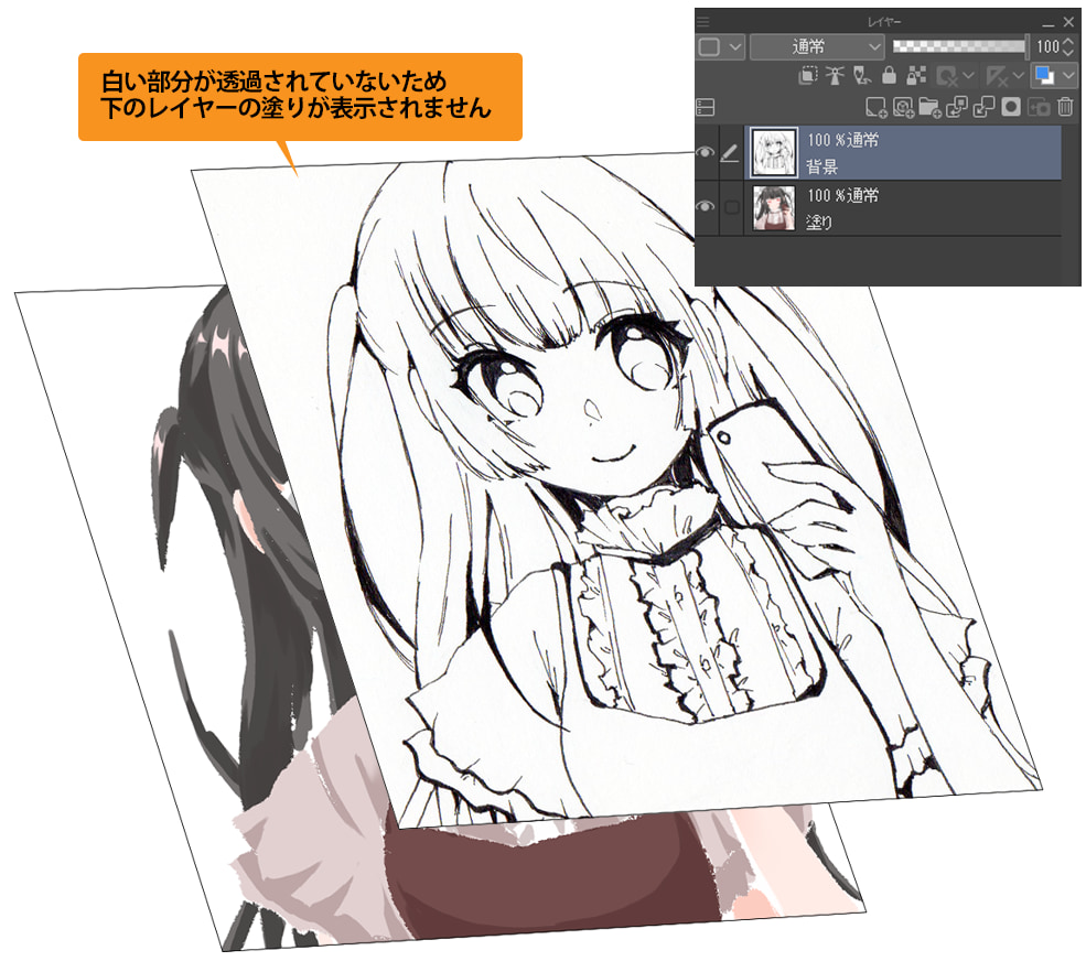 現在のレイヤーは、白地に線画が描かれている状態です。