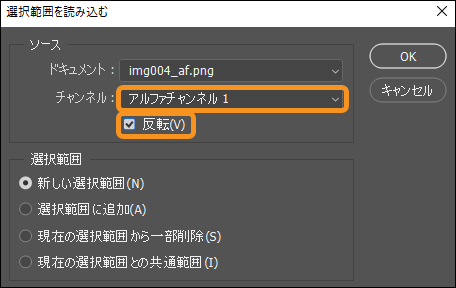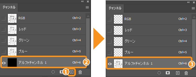 (2)[チャンネル]で、先ほど作成したアルファチャンネルを選択します。