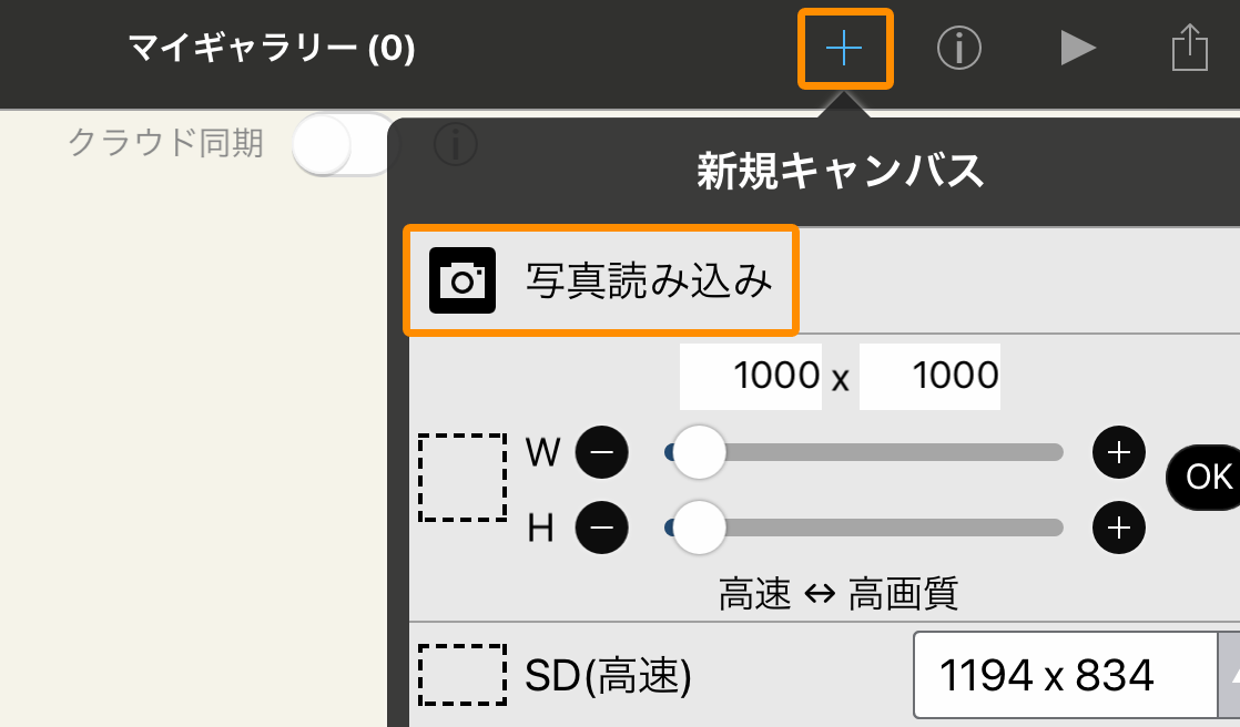アイビスペイントを起動し、[マイギャラリー]の[+]をタップします。