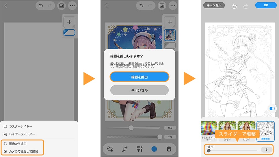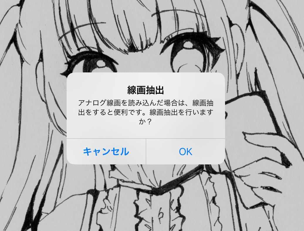 読み込むと、線画抽出についてのポップアップが表示されるので[OK]をタップします。