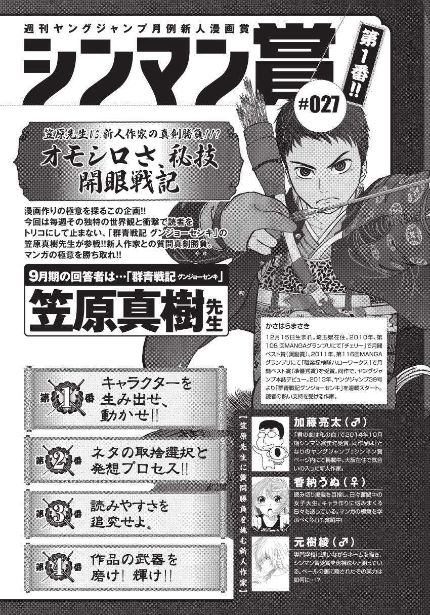 マンガのタネ&ネタを生み出すには!? 漫画作りの極意を探るこの企画!! 今回は毎週その独特の世界観と衝撃で読者をトリコにして止まない、「群青戦記 グンジョーセンキ」の笠原真樹先生が参戦!! 新人作家との質問真剣勝負。ヤングジャンプ新人漫画賞「シンマン賞」大人気企画からインタビューを特別掲載!