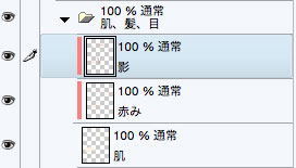 赤みレイヤーの上に新規ラスターレイヤーを追加し、影を塗り込んでいきます。