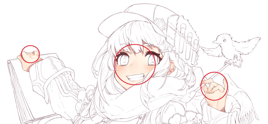 線画の下では埋もれてしまう部分も、線画の上から描き込むことで、さらにクオリティが上がったり、表情が豊かになることがあります。