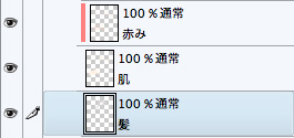 肌レイヤーの上に新規ラスターレイヤーを作成し、[下のレイヤーでクリッピング]をオンにします。これにより、肌のベース色からはみ出さずに赤みを付けていくことができます。