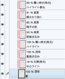 こちらも新規レイヤーを[合成モード:乗算]で作成して塗っています。それぞれ、不透明度を調整して見え方を確認します。