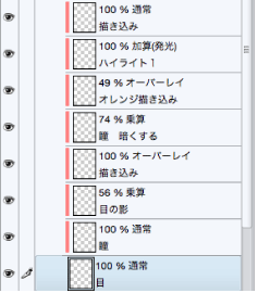 さらに[合成モード:オーバーレイ]の新規レイヤーを作成し、オレンジ色を瞳の上部にプラス。
