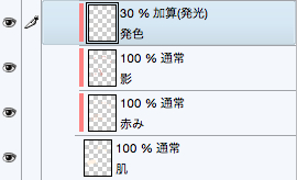 影レイヤーの上に新規ラスターレイヤーを作成して[合成モード:加算(発光)]、[不透明度:30%]に設定します。