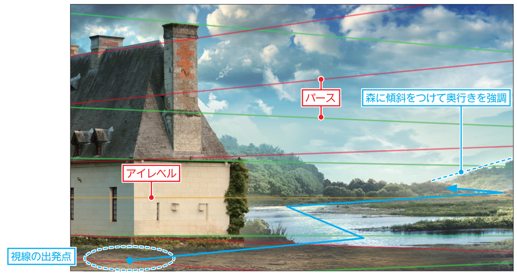 近景の地面を出発点にそのまま川を経由し、建物を辿って左奥へ流れていくようにしています。中景にも森を配置したのは、そこに障害物がないと左奥まで一直線に視線が飛んでしまうためです。それでは視線の移動が単調で物足りないイラストになってしまいます。