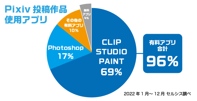 投稿作品の89%以上で有料のお絵かきツールが使用されています。本気で作品を制作・公開したいユーザーほど、有料のものを購入する傾向が高いといえそうです。