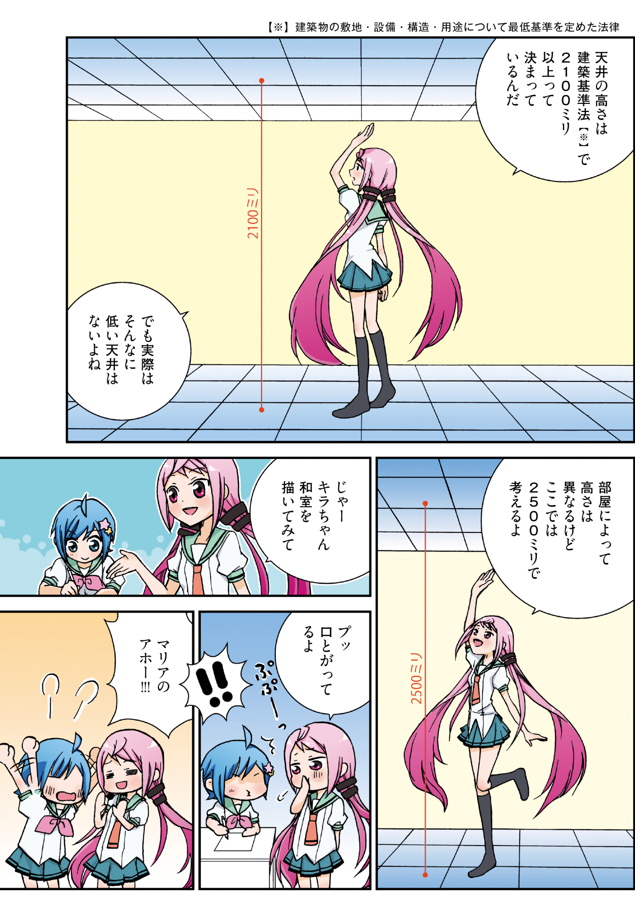天井の高さは建築基準法(建築物の敷地・設備・用途について最低基準を定めた法律)で、2100ミリ以上と決まっています。