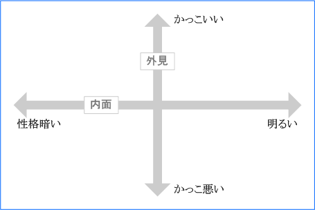 図では、縦軸に外見(かっこいい・悪い)、横軸に内面(性格明るい・暗い)を選びましたが、自分で理解しやすい、イメージしやすいものでいいでしょう。