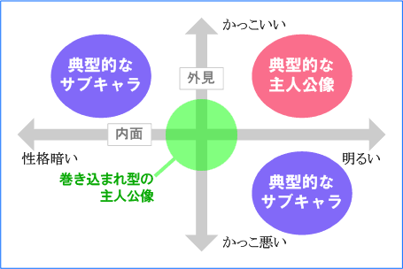 主人公でよくあるのは(かっこいい)と(性格明るい)のエリアに入るキャラです。