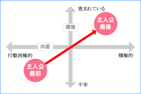 最初はマイナスの要素を抱えた主人公が、エピソードを通して、成長していく、大人になっていく…などの場合は、図のようにあえて位置を変えてもいいかもしれません。