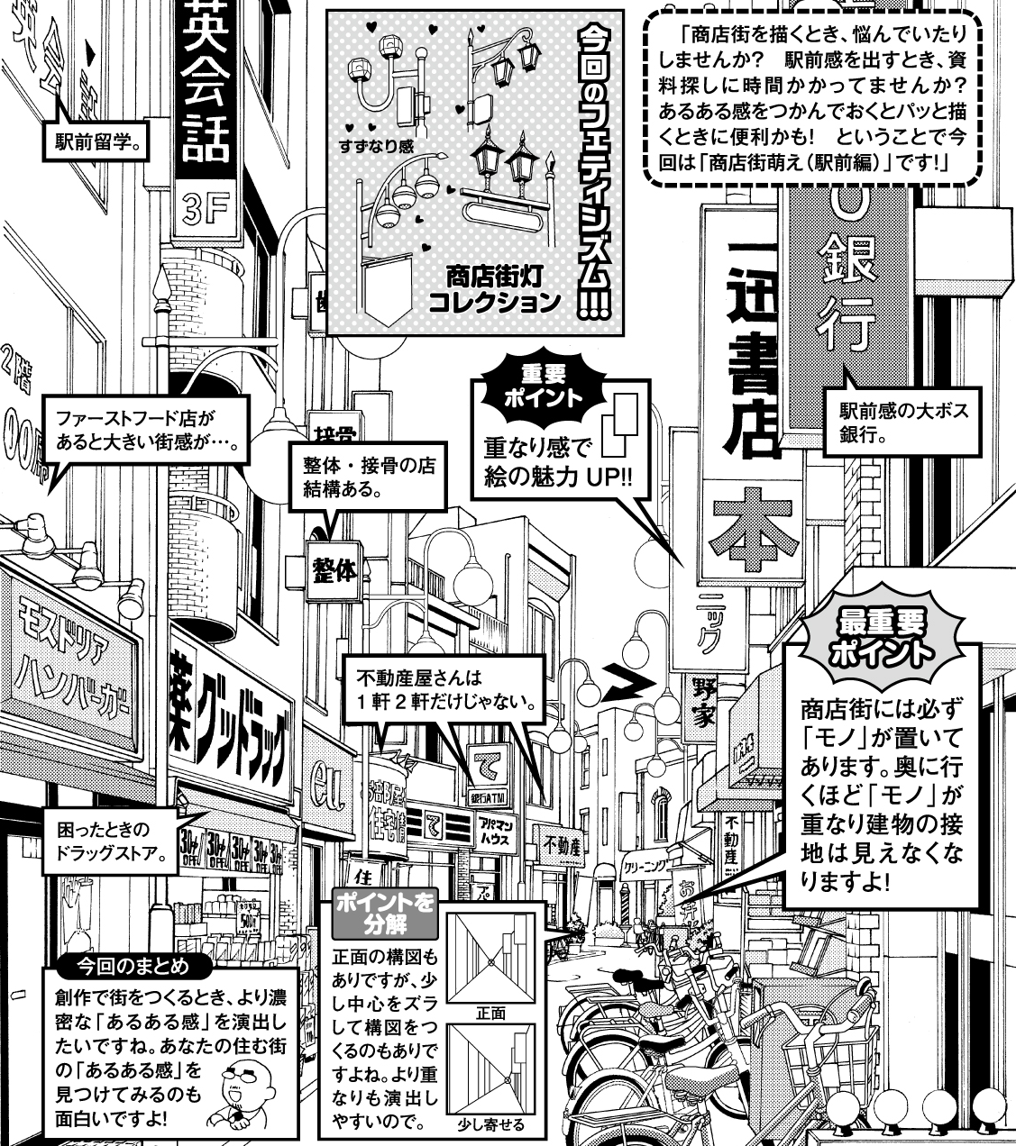 「MAEDAXの背景萌え!」とは? 「背景」に悩む人を対象に、使える技術を提供し、日本の漫画全体の充実を目指す。某業界ではメジャー級の有名人、「アシスタント背景美塾MAEDAX派」のMAEDAXがコッソリ教えます。今回は駅前商店街の描き方編!