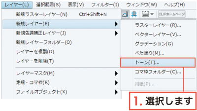 1.[レイヤー]メニュー→[新規レイヤー]→[トーン]を選択して、