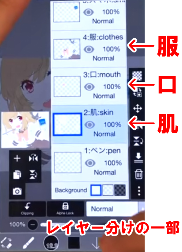 肌、目、口、髪、帽子・服など、色や質感などが違うパーツごとにレイヤーを分けます。