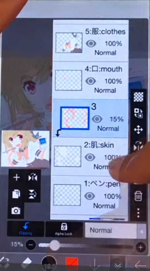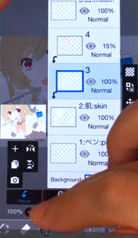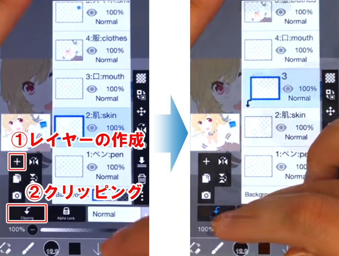 レイヤーウィンドウ(下部アイコン右から2番目)を開いて、肌レイヤーの上に新規レイヤーを追加しクリッピングをオンにします。