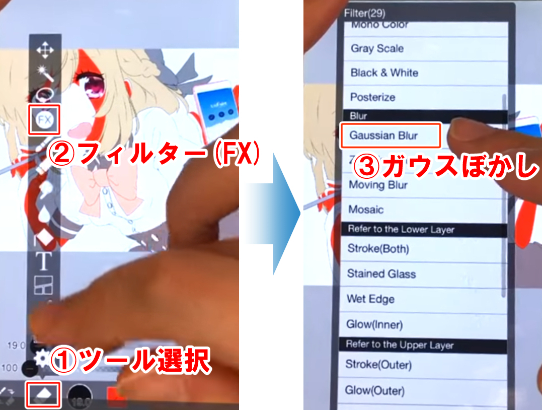 肌を塗り終えたら、ツール選択ウィンドウの「フィルター(FX)」から「ガウスぼかし」を選択。