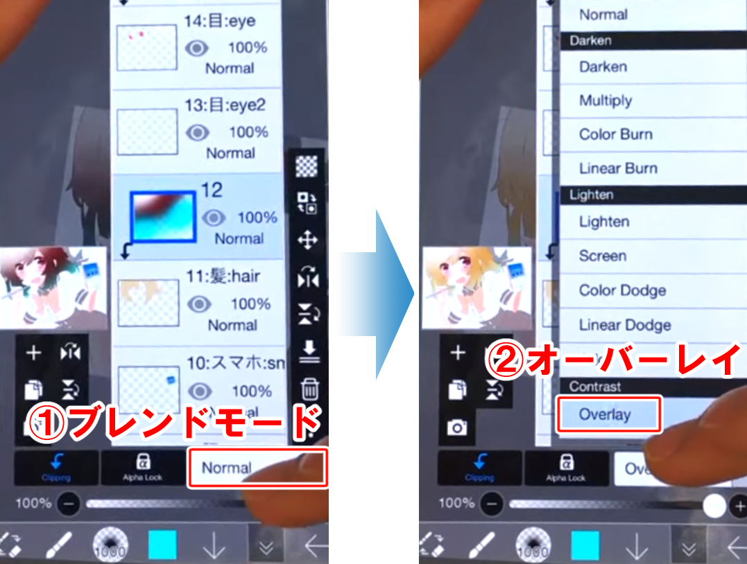 ブレンドモード(レイヤー下の「普通」表示のバナー)から「オーバーレイ」を選択します。