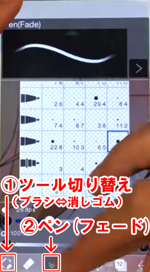 ①ツール選択:線を描くブラシツールや消しゴムツールを選択する場合は、ここでまずツールを選択します。