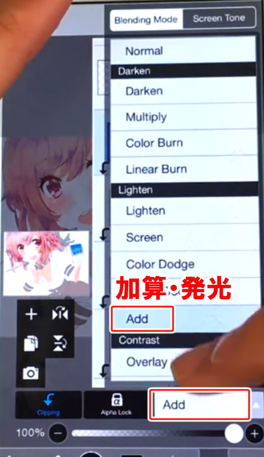 レイヤーウィンドウを開き新規レイヤーを追加しブレンドモードから「加算・発光」を選択します。不透明度は15%に設定しました。