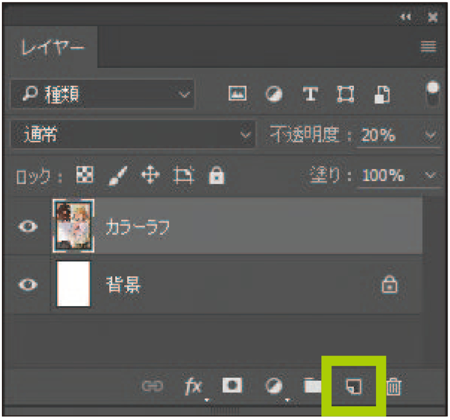 カラーレイヤーの不透明度を20% にして、その上に線画用の新規レイヤーを作ります。