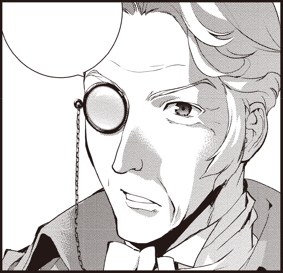 「チェーン付きの片眼鏡」が知的な雰囲気を醸し出している。