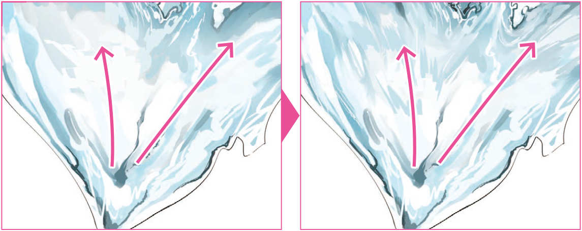 中央は勢いのある流れるようなラインを描き、先端は水が溜まってるように丸みを帯びている様子を描くと水の質感が出ます。
