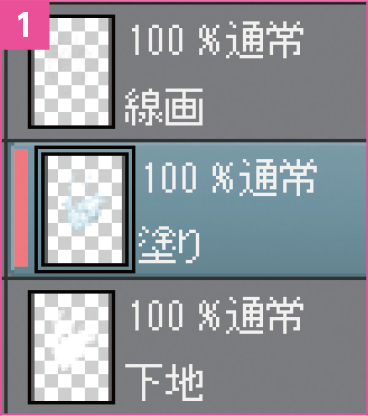 レイヤー「下地」の上にレイヤー「塗り」を作成してクリッピングします。