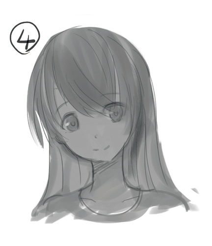 3. さらに少し暗めの色を使って目や髪の毛、首の影など暗い部分を描きます。