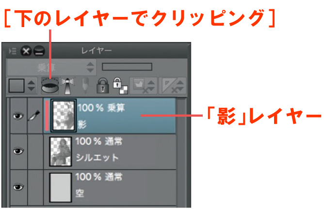 [乗算]モードのレイヤー「影」を一番上に新規作成し、[下のレイヤーでクリッピング] をクリックします。