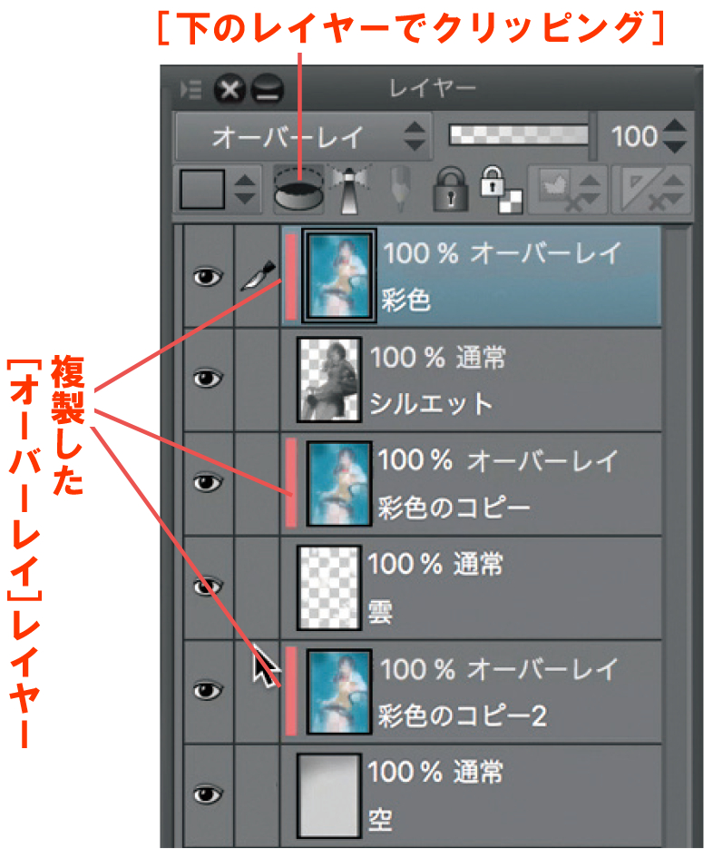 ちなみに、[加算(発光)]モードのレイヤーで明るくするだけでなく、[乗算]モードのレイヤーで暗くする効果を加えることもあります。