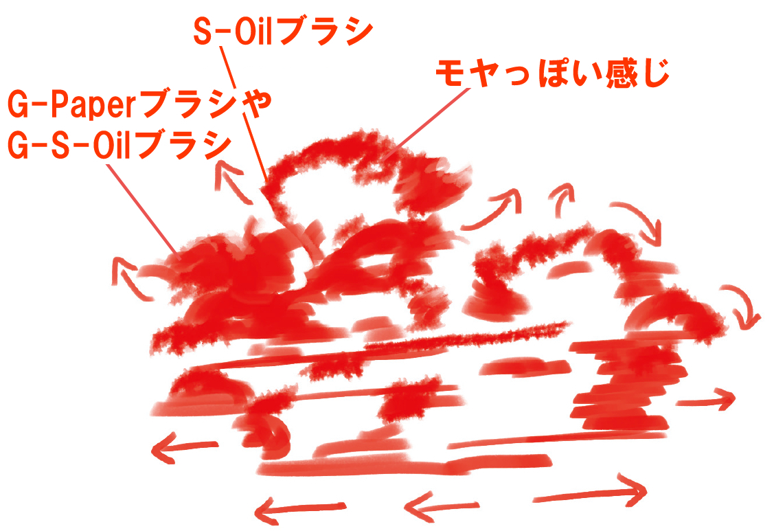しかし、U-Cloudブラシを使うだけだとメリハリがなくなってしまうので、雲の上部などシャープなエッジがほしい部分はS-Oilブラシを使ったり 、逆にもっとぼかす部分は、G-PaperブラシやG-S-Oilブラシなどを使います 。